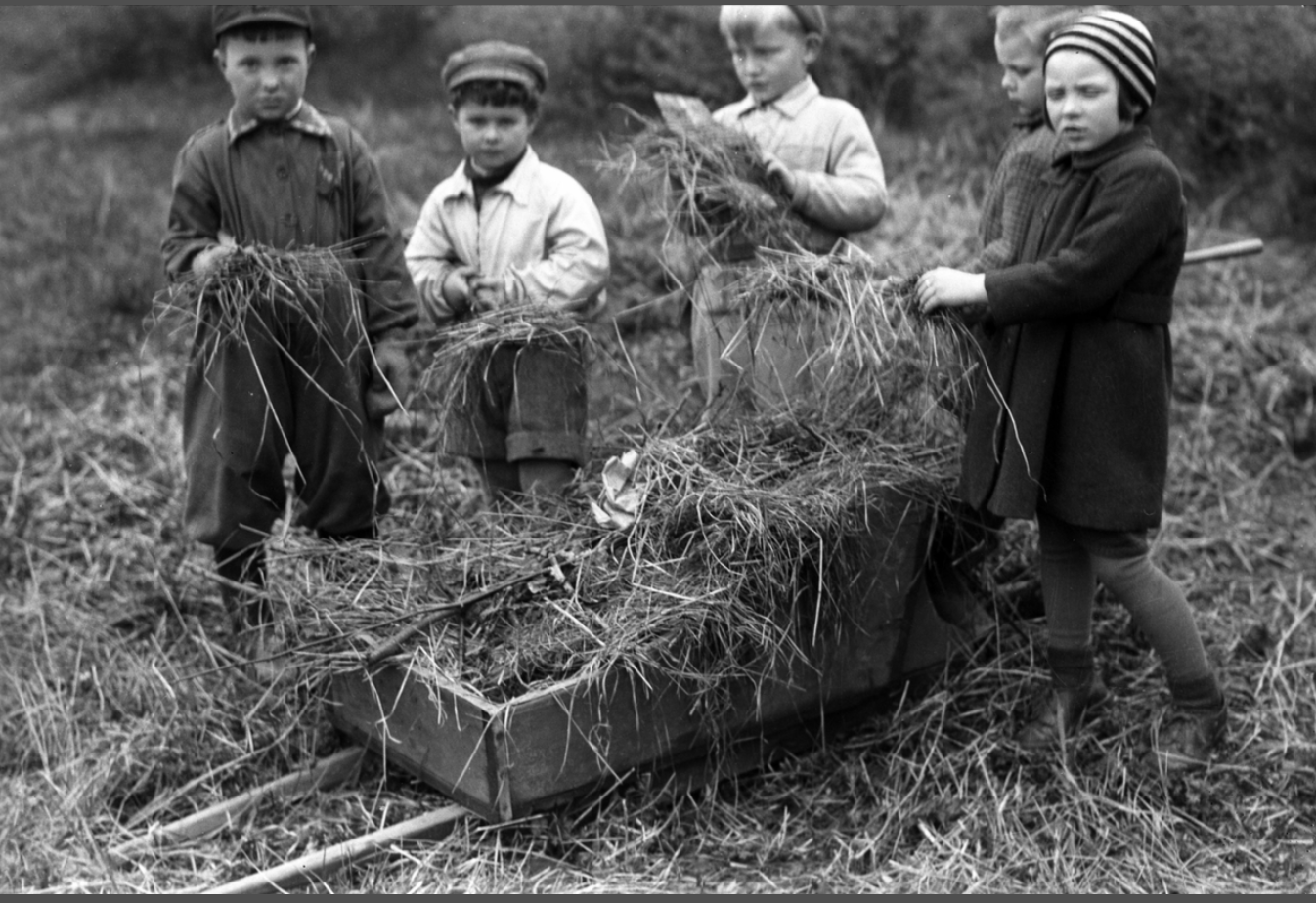 Det andre fotoet viser noen barn i høsthagen, hvor gresset har fått vokst seg høyt og sterkt. Det ser ikke ut til at gresset ble slått gjennom sommeren, og det har nå en litt halsstarrig, muggen og vissen kvalitet. Barna står rundt en liten trillebår i tre, og med små raker jobber de for å få unna alt gresset. Mengden gress virker overveldende, og jeg lurer på om barna vil klare jobben uten å miste motet.
